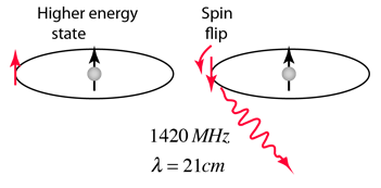 Točna frekvencija zračenja iznosi 1420.406 MHz no ukoliko zračenje dolazi iz sustava koji se giba u odnosu na promatrača, tada će doći do promjene frekvencije opaženog zračenja. Prema plavom djelu spektra ako se izvor giba prema promatraču, ili prema crvenom djelu spektra ako se izvor udaljava od promatrača. Tu pojavu zovemo Relativistički Doplerov efekt. Zračenje koje detektiramo dolazi iz naše galaksije, koja također rotira. Različiti djelovi galaksije se gibaju različitim brzinama u odnosu na nas i mjerenjem Doplerovog pomaka tog zračenja možemo izračunati brzinu vrtnje galaksije.
